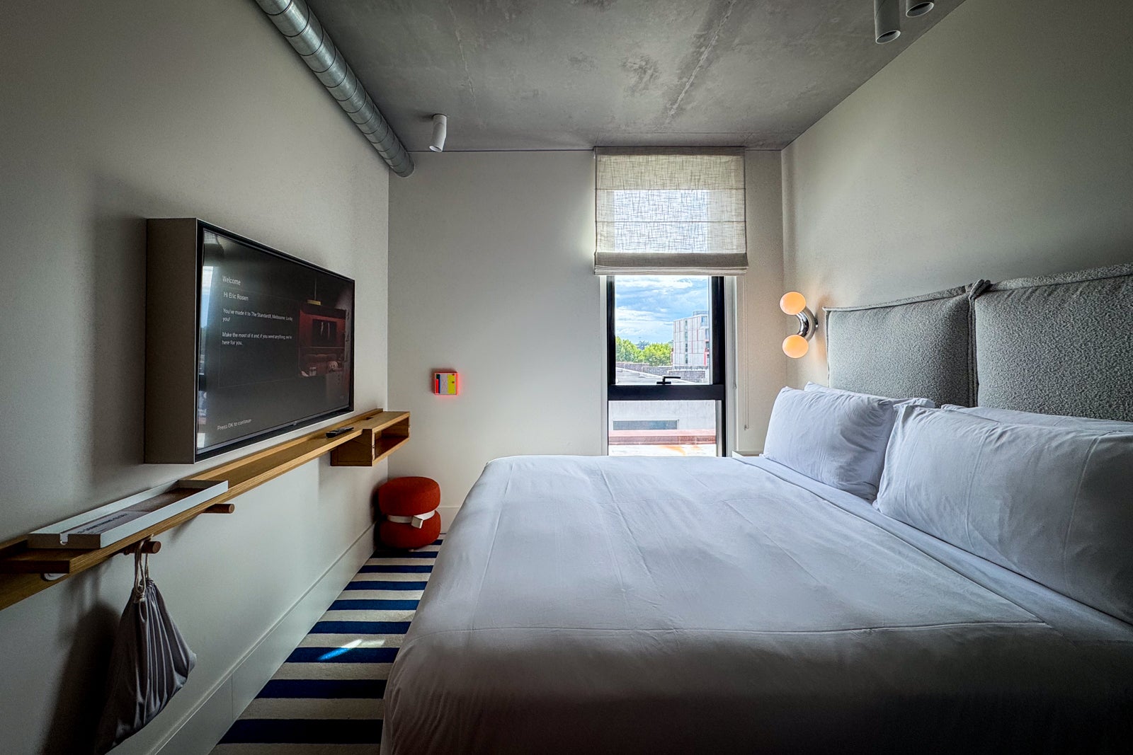 There was plenty of light from the single window, and the blue-and-white striped carpet gave the space a cheery look, as did the white-sheeted bed with its slim-profile fabric headboard.