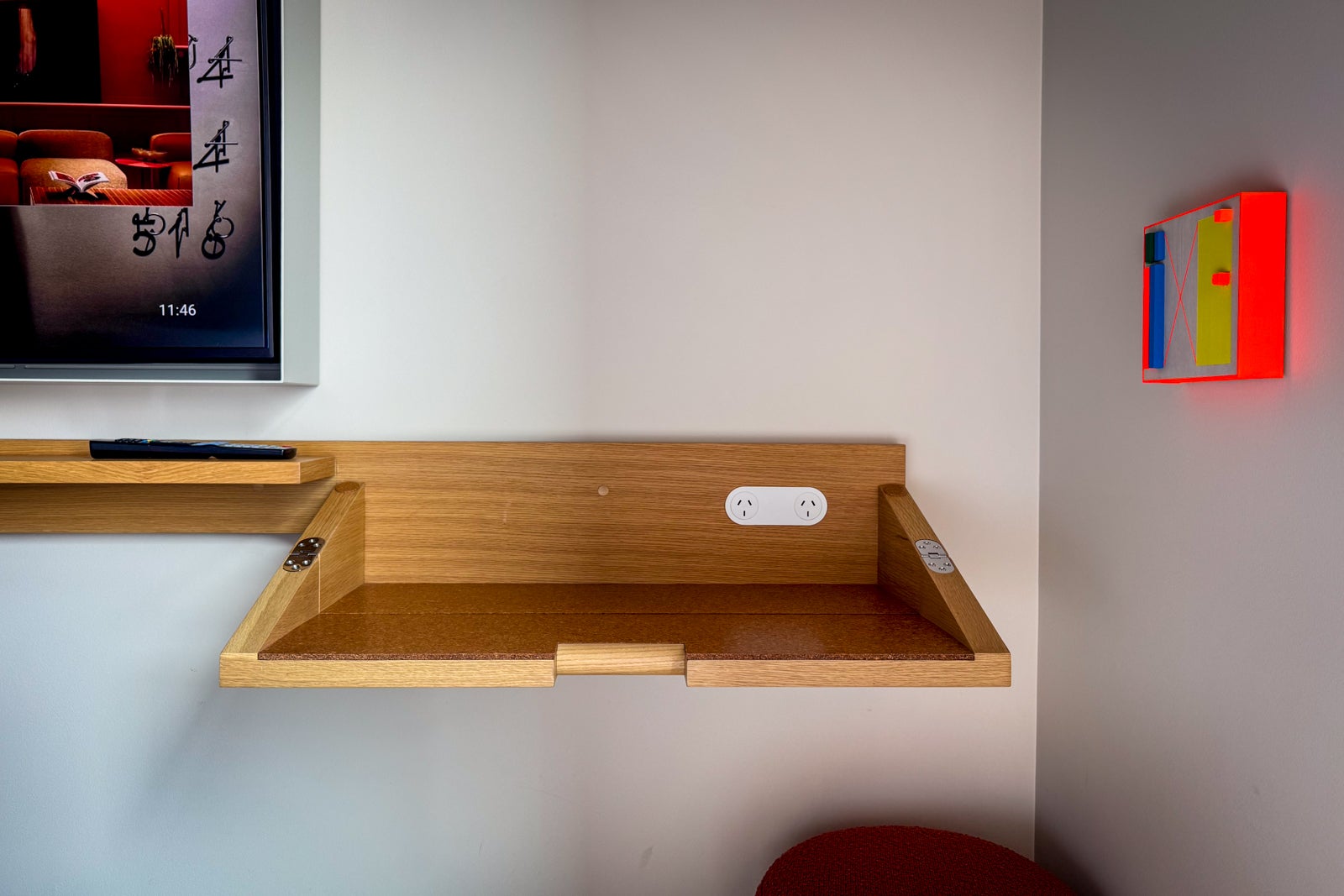 Everything seemed to have been placed with an eye for space efficiency, from an exposed single-rod closet to a desk that folded out from the wall with a single pink pouf to sit on, as well as the 50-inch wall-mounted flat-screen television across from the bed.
