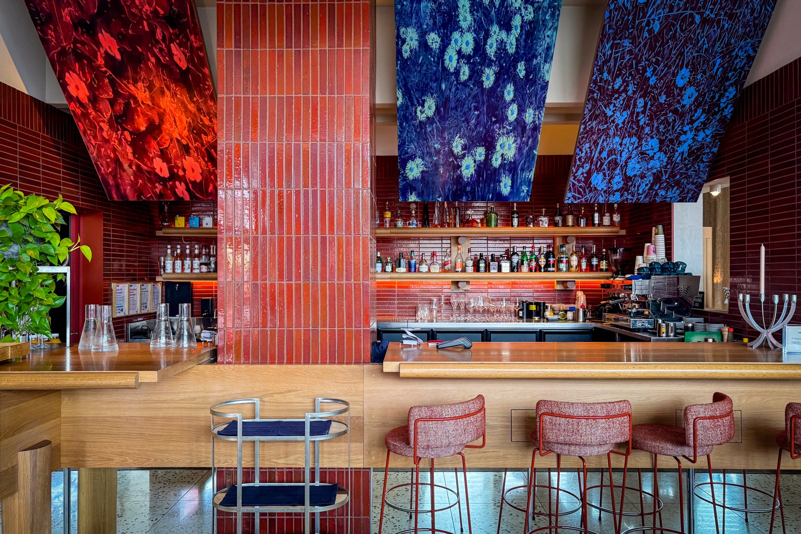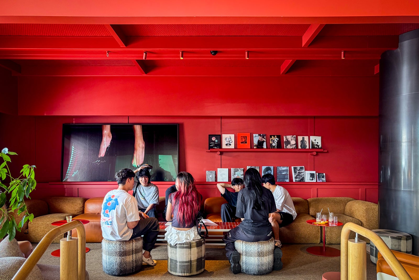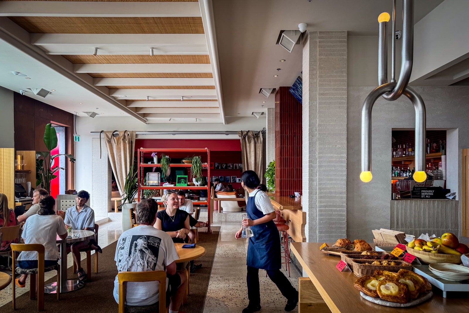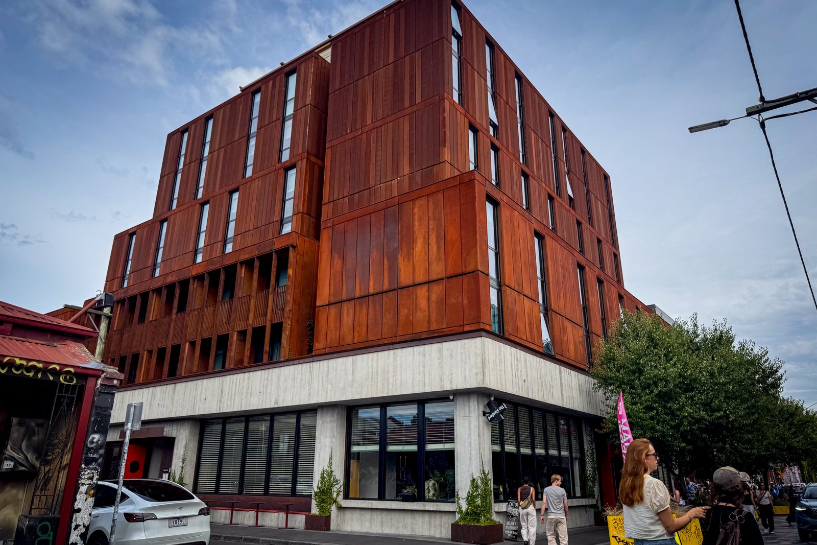 The new hotel fits right into that mixed-use melange with a dramatic, rusty-looking, weathered-steel facade designed by Australian firm Woods Bagot, complete with a candy-apple-red revolving door.