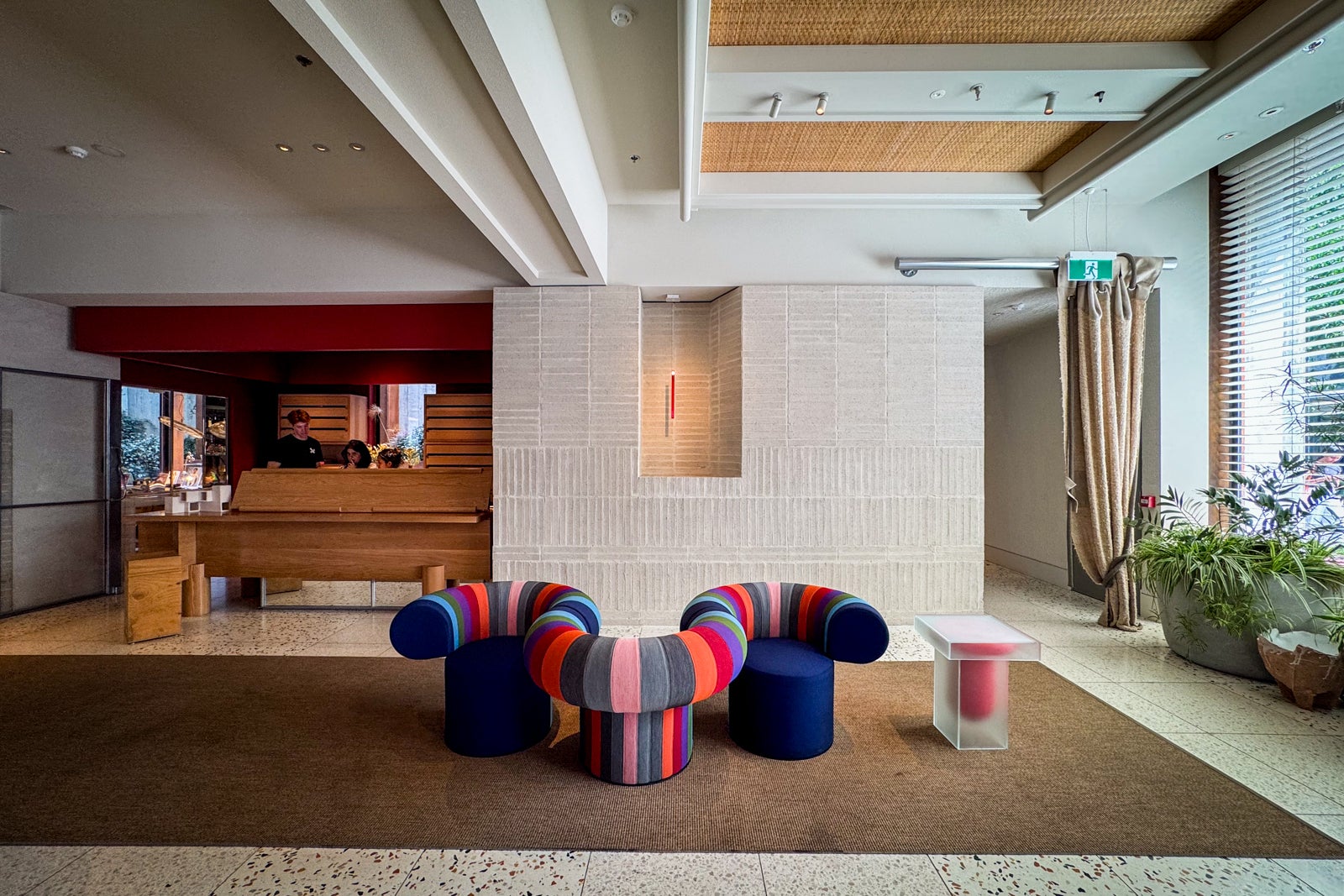 Inside the terrazzo-tiled reception area, you'll find unique seating vignettes, including a caterpillarlike connecting Big Talk armchair by designer Adam Goodrum, columns swaddled in macrame produced by local artist Sarah Parkes, vintage leather sofas and armchairs, and even a cozy fireplace for cold nights.