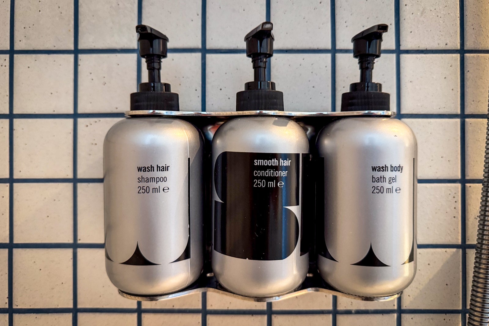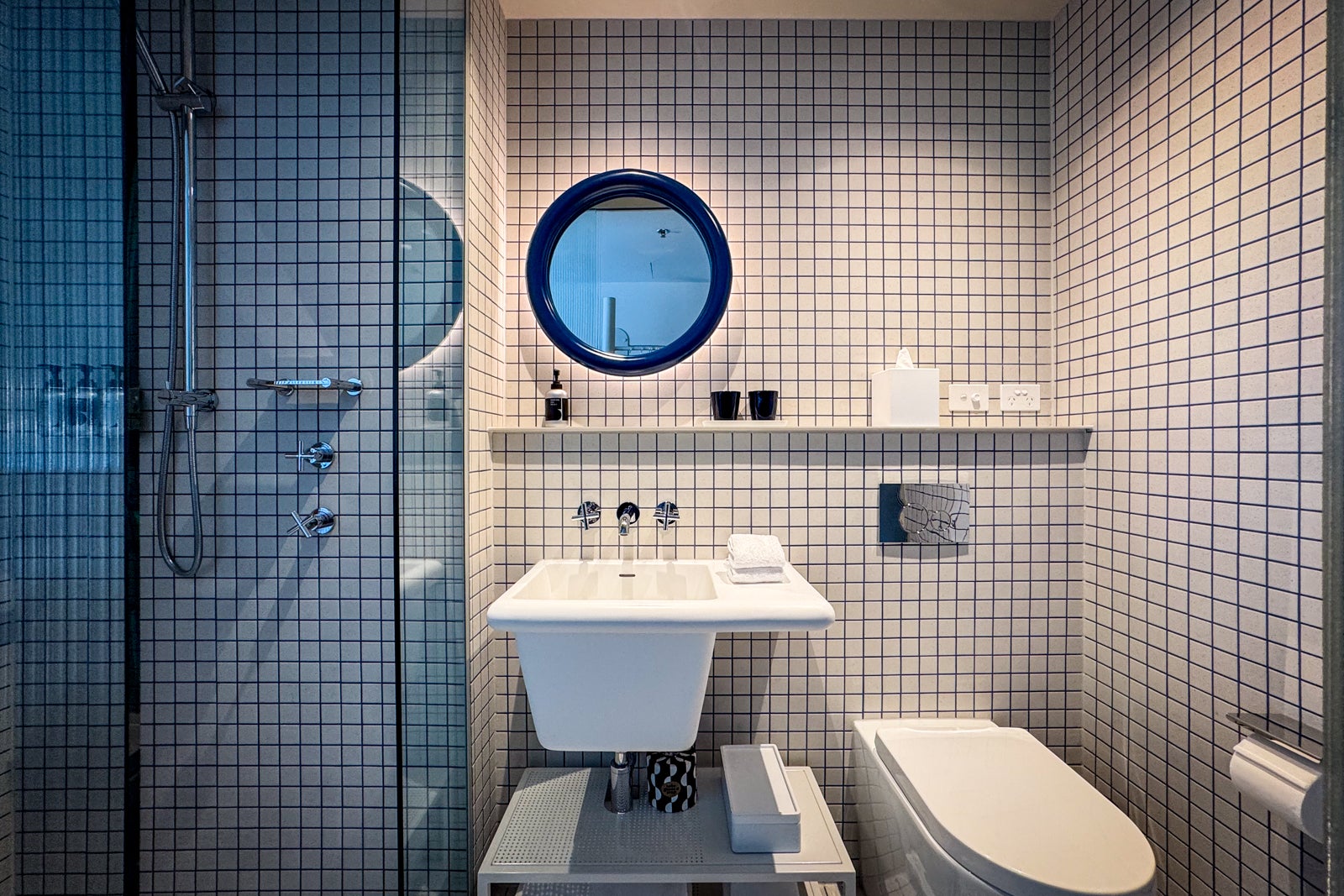 White tiling with unusual blue grouting completed the clean look. The hotel stocked a few Davines amenities, but the hair and body wash products in the shower had the Davines branding scratched off.