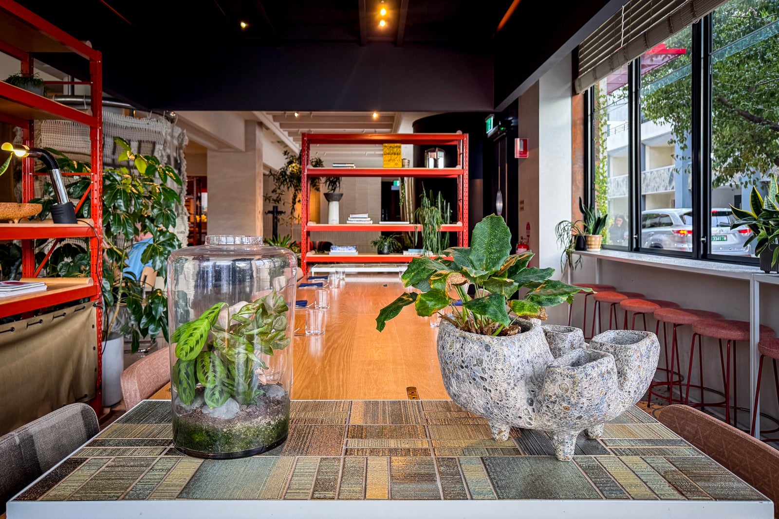 Plenty of art books and plants line the shelves, and there's a living room-style space adjacent to the ground-floor bistro. The vibe is like a Soho artist's loft from the early '80s crossed with a contemporary coworking space.
