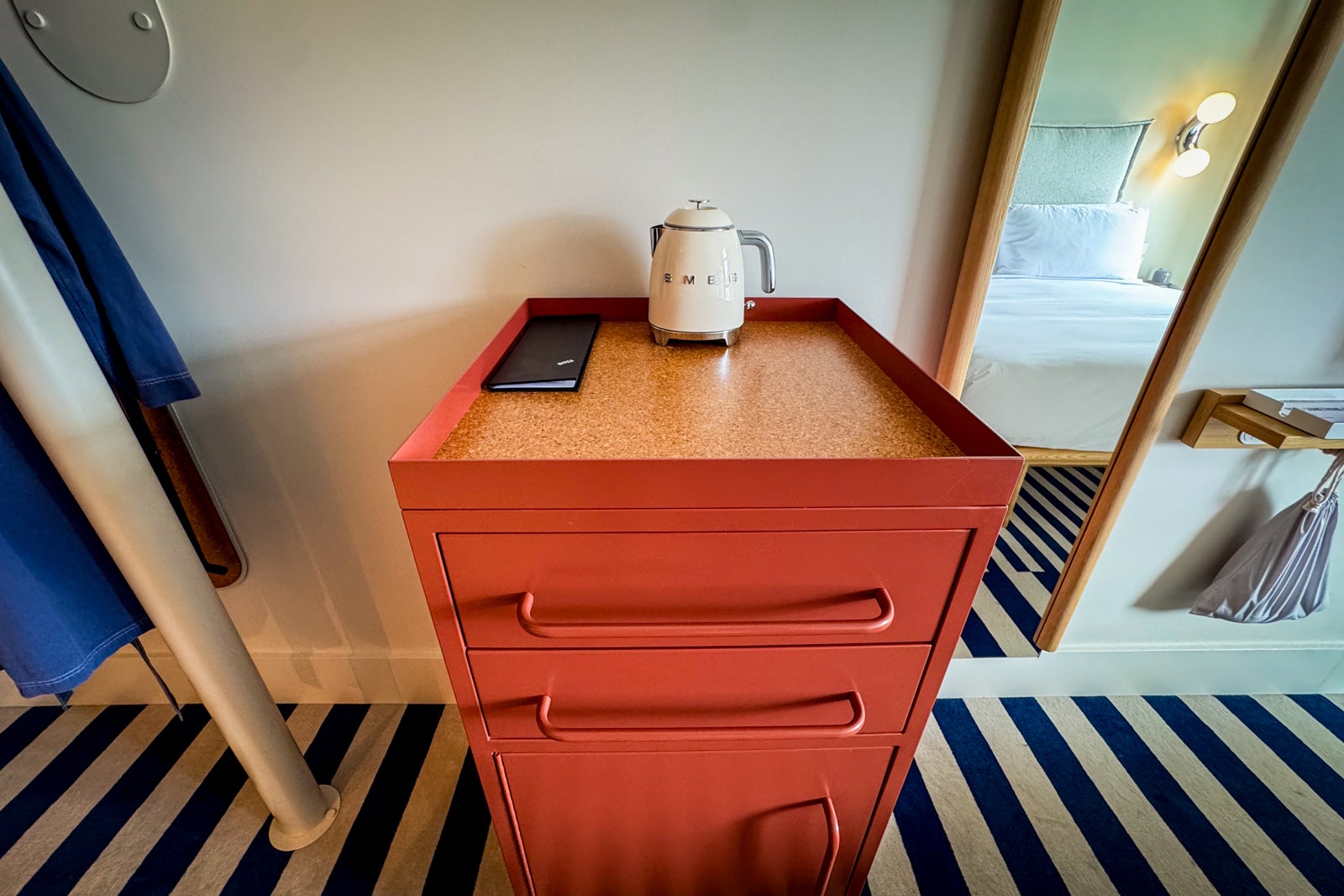 But some of the space-conscious elements were playful, too, including a colorful steel fixture hiding the minibar, complete with an incongruous chrome foot. Speaking of the minibar, there was a Smeg water kettle for making the provided tea or instant coffee and an empty fridge you could stock with your own provisions.